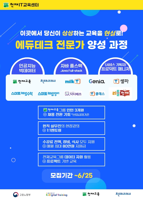- [취업] [천재교육]채용전환형 프로젝트 기반 빅데이터/풀스택(Java)/PM 과정 인재 추천 및 모집 안내